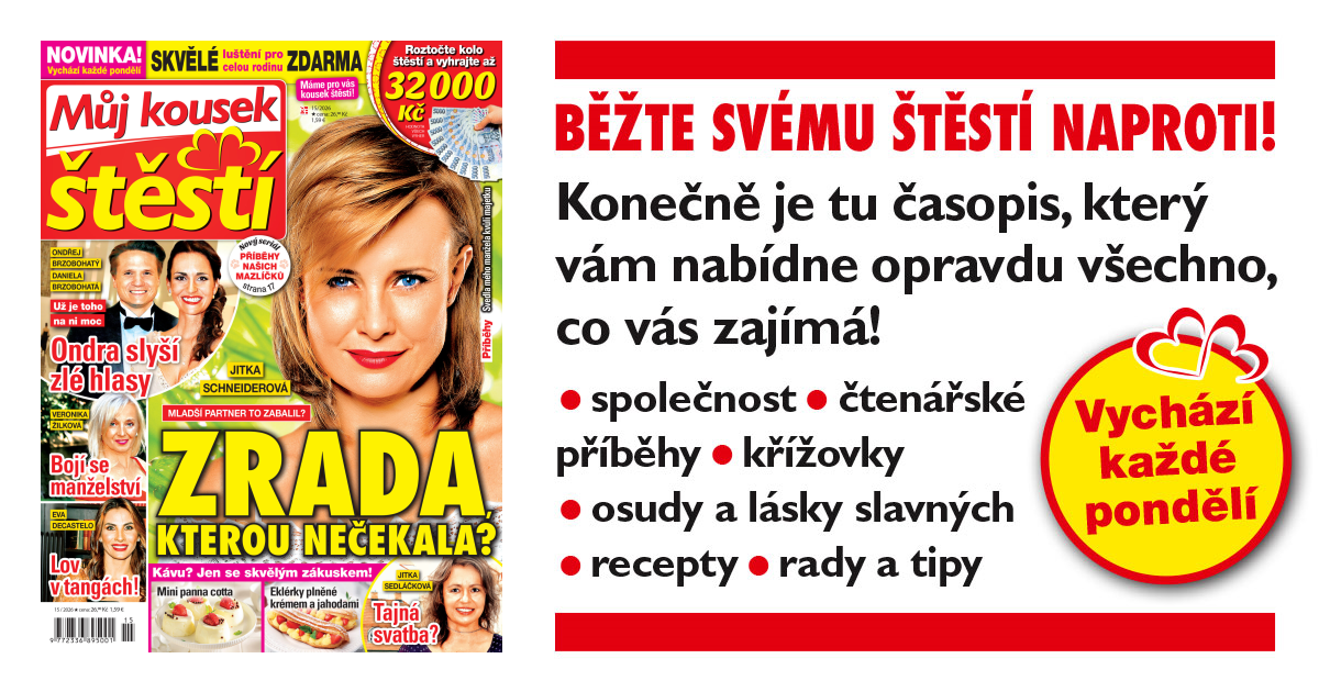 Nahlédněte s časopisem Můj kousek štěstí do šaten televizních studií a do soukromí české smetánky. Čím žijí vaši oblíbení seriáloví herci a herečky? Jaké skandály bublají pod povrchem zdánlivého klidu známých celebrit? Dozvíte se na třinácti stranách žhavého textu a přitažlivých fotek.
