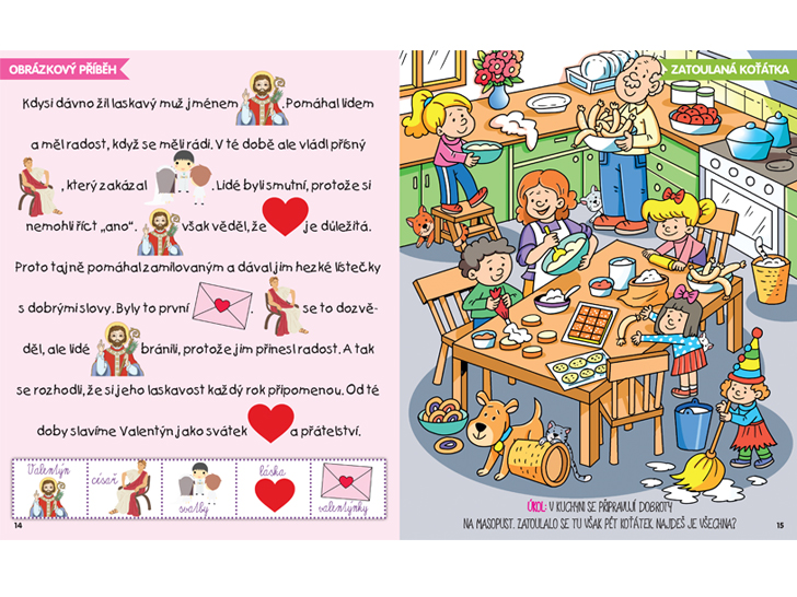 Víš, jak vlastně vznikl Valentýn, svátek zamilovaných, který slavíme 14. února? Že ne? Náš obrázkový příběh ti napoví! Můžeš si také procvičit svá očička a pozornost. Na obrázku visíš přípravy na masopust. Maminka s tatínkem chystají koláče a jitrnice na tradiční oslavu, děti jim pomáhají a všude je velikánský chaos. Do toho všeho se po kuchyni schovává několik koťátek. Najdeš je všechna?