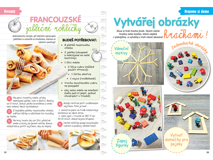 Když zrovna počasí ven neláká, spoustu zábavy si můžete užít i doma v kuchyni nebo v pokojíčku. Přinášíme recept na lahodné jablečné rohlíčky z toustového chleba a tipy na skvělé a poučné hry se stavebnicí.