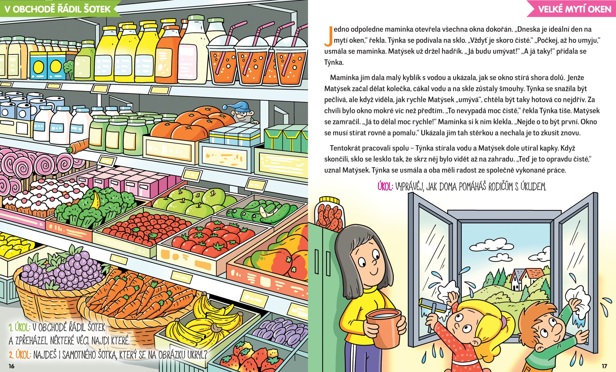 Zboží v obchodě je přeházené. Co kam patří? A odhalíš šotka, který to nadělení způsobil? Ponoř se také do příběhu Týnky a Matýska, kteří doma pomáhali s úklidem a pak vyprávěj, jak doma pomáháš ty.