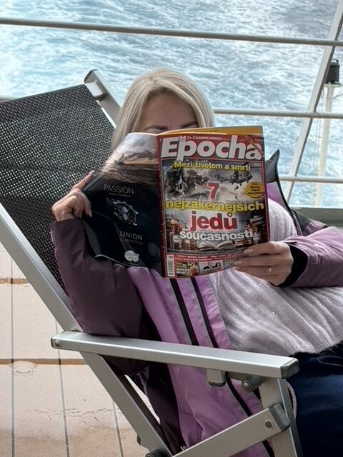 „Ještě že se naše loď nejmenovala Titanic,“ vtipně glosovala plavbu po Středozemním moři Iva. Tep jí stoupal hlavně ve chvíli, kdy se vlny rozhodly ukázat, kdo je na vodní hladině pánem. Přestože bylo neustále na co koukat, oblíbený časopis byl na palubě samozřejmě též.