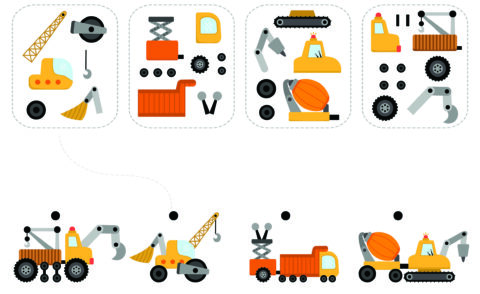 Na stavbě mají trochu problém. Aby mohli pokračovat v práci, musíš jim pomoci spojit pracovní auta s jejich správnými díly.