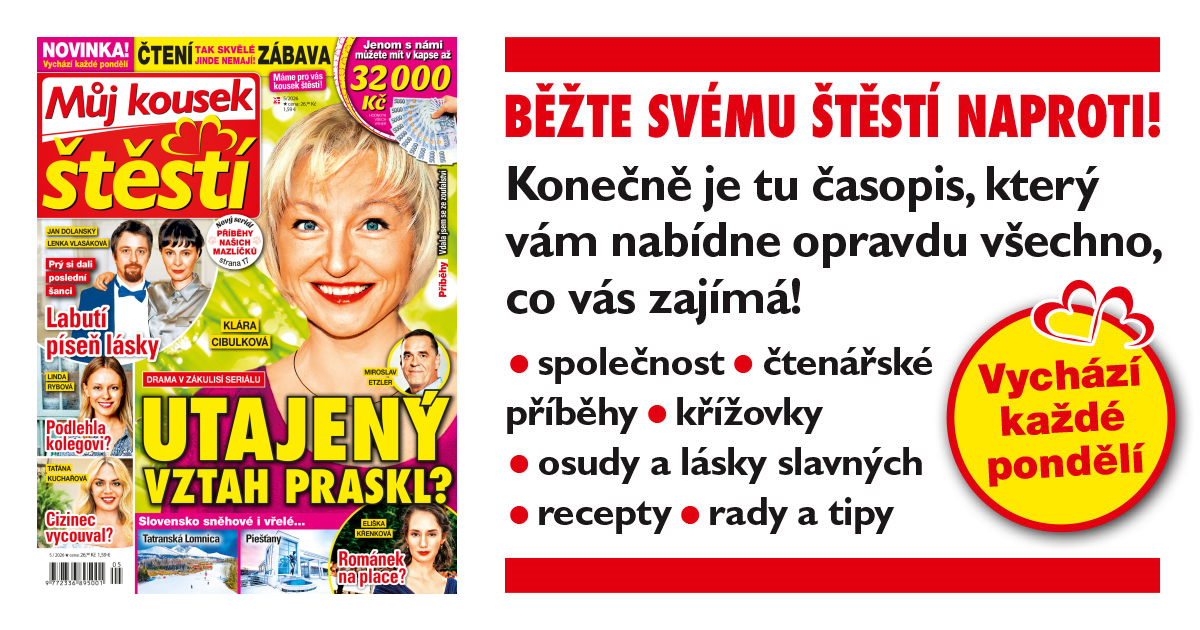 Nahlédněte s časopisem Můj kousek štěstí do šaten televizních studií a do soukromí české smetánky. Čím žijí vaši oblíbení seriáloví herci a herečky? Jaké skandály bublají pod povrchem zdánlivého klidu známých celebrit? Dozvíte se na třinácti stranách žhavého textu a přitažlivých fotek.