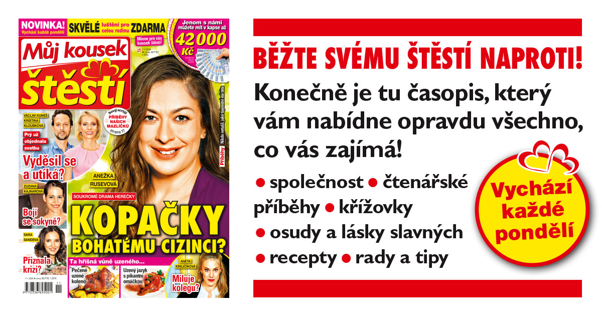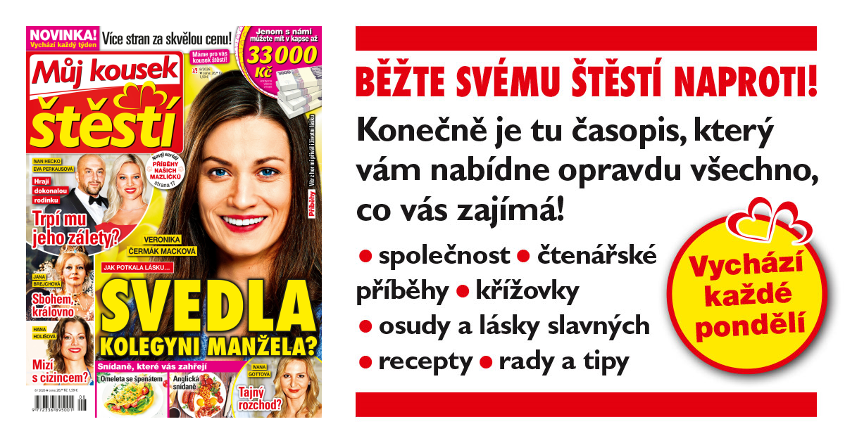 Dokonalý servis s radami, které se týkají vašeho zdraví, péče o tělo, cesty k vlastní kráse, ale i za krásou v exotických zemích. Potřebujete poradit, co chybí vašemu mazlíčkovi? Trápí vás soused a chcete znát názor právníka? Rozhodli jste se vyrobit dárek pro svůj milý protějšek vlastnoručně? To a mnoho dalšího najdete v časopise Můj kousek štěstí.